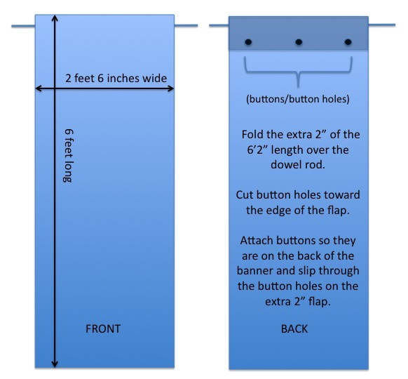 Note: You will want to go ahead and fold over the extra 2 inches and secure/fasten the buttons BEFORE you begin decorating your banners. Judges have noted that banners are “too short” and/or you can tell decorations have had to be removed/moved because folks forgot about the dowel rod slot! This could effect your chances of winning!