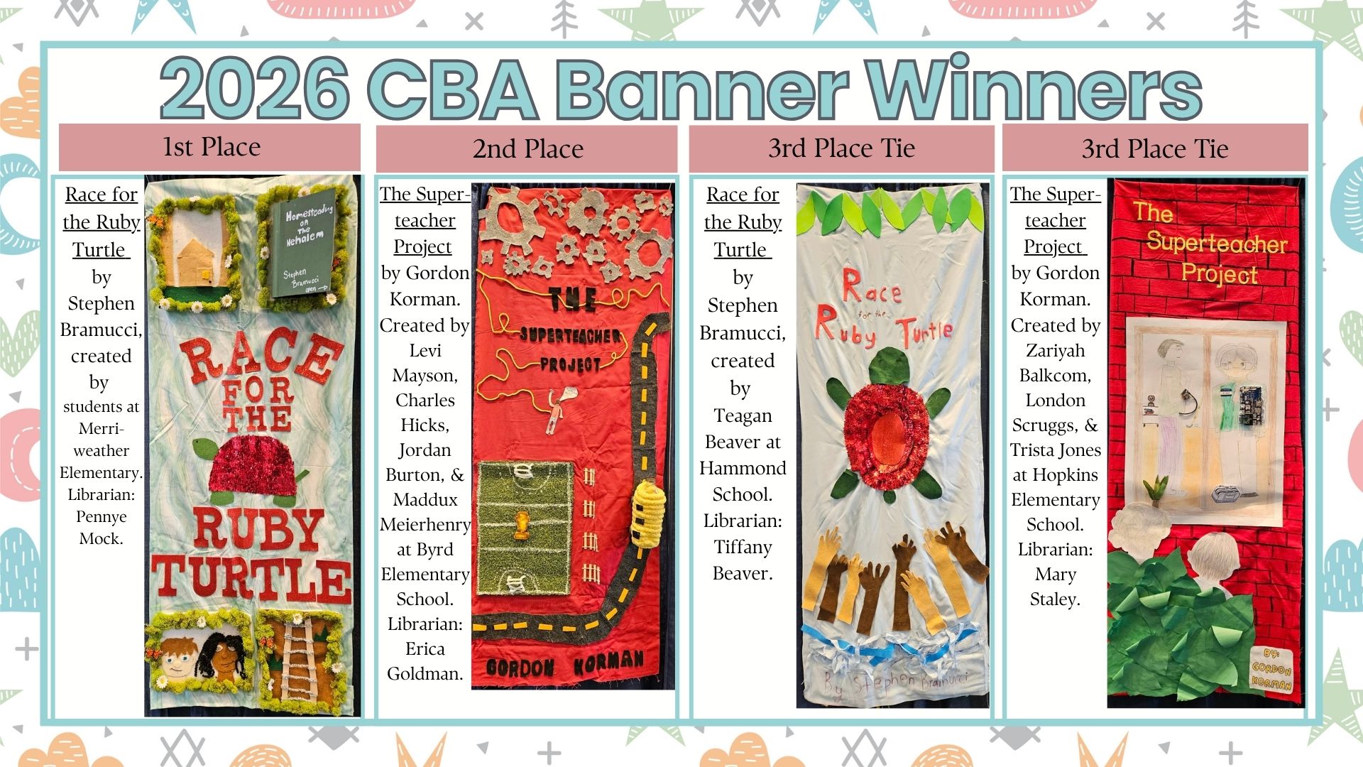 Certificates of participation will be provided to each participating school. In addition, a ribbon for first, second, and third place in each category will be awarded at conference and a prize of $100.00 will be awarded to the school of the first place winner in each category; $75.00 will be awarded to the school of the second place winner in each category; and $50.00 will be awarded to the school of the third place winner in each category. The award checks will be mailed to the school media specialist unless otherwise requested. Banners will not be mailed back - they must be picked on the last day of conference.