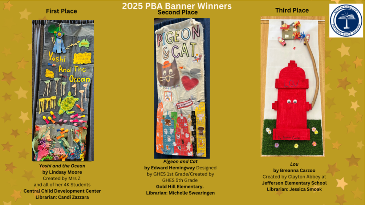 Please review the Book Award Banner Judging Rubric for specific details judges will be looking for when reviewing the banners. Each banner will be judged on the authenticity of the art as it relates to the book as well as on the artistic quality of the banner. All artwork must be the original work of the child(ren) involved. The banner must be a student project. Adult input should be advisory in nature and kept to the minimum required by the age group participating. Certificates of participation will be provided to each participating school. In addition, a ribbon for first, second, and third place in each category will be awarded at conference and a prize of $100.00 will be awarded to the school of the first place winner in each category; $75.00 will be awarded to the school of the second place winner in each category; and $50.00 will be awarded to the school of the third place winner in each category. The award checks will be mailed to the school media specialist unless otherwise requested. Banners will not be mailed back - they must be picked on the last day of conference. A school may win only one first place award but may receive other award levels. Schools may only submit one banner per judging category to the banner competition. Schools may only submit banners in categories in which they are qualified to vote (i.e. a 4K – 5 grade school may be participating in PBA and CBA, and therefore may have two banners in the competition, one at each category level).