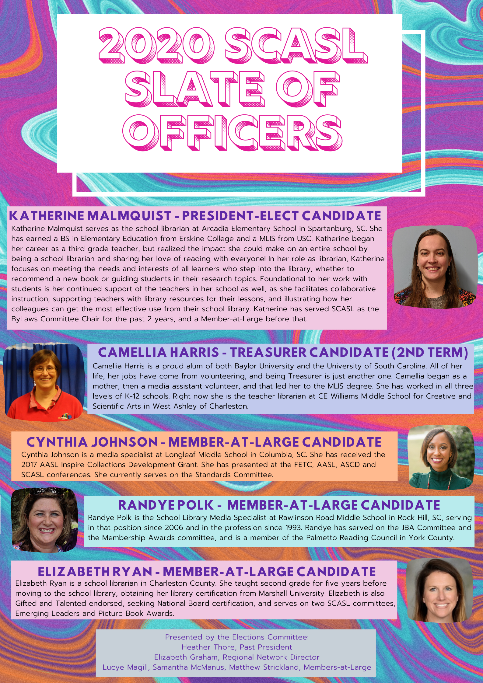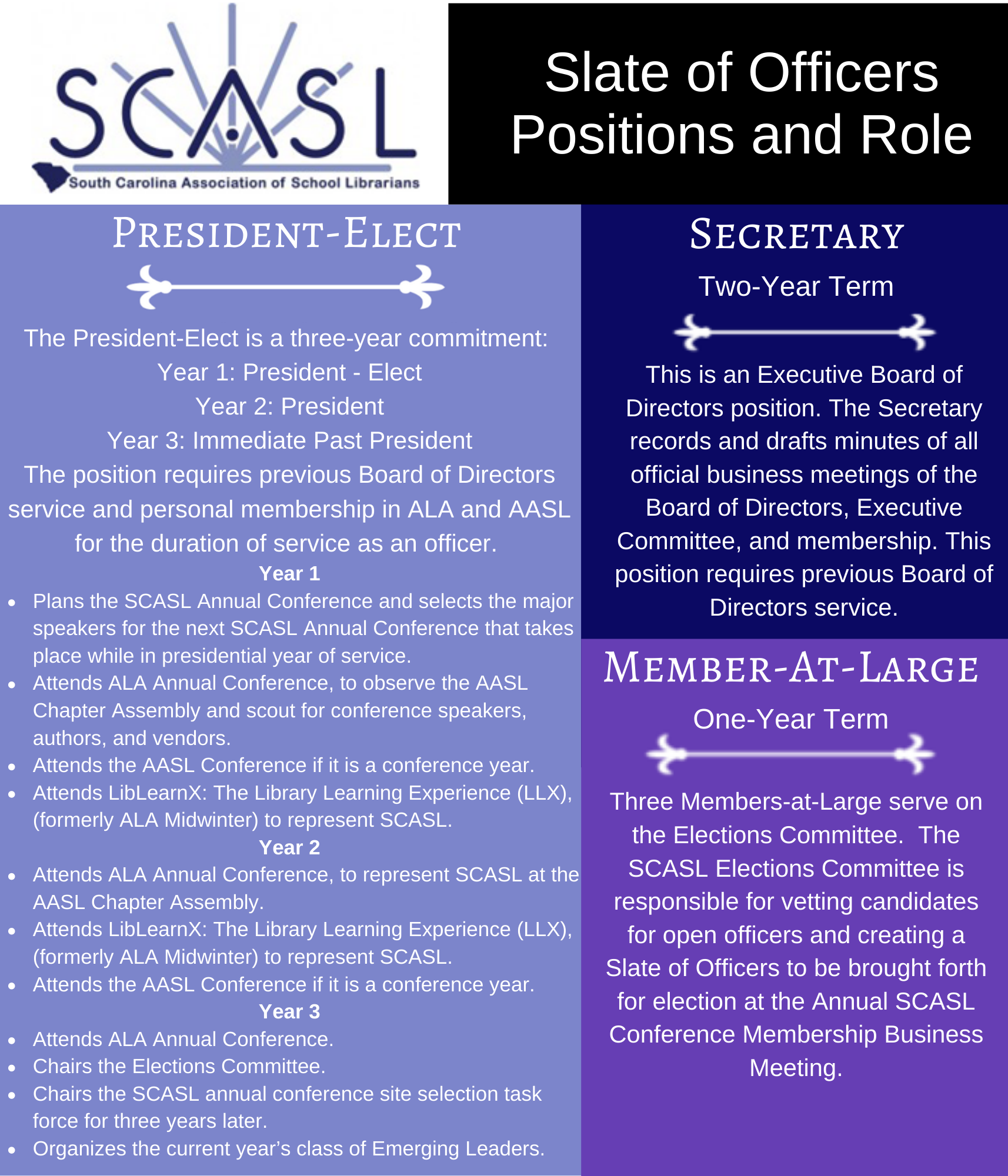 Elections CommitteeThe SCASL Elections committee is seeking nominations for the 2026-2027 Slate of Officers consisting of President-Elect, Treasurer, and three Election Committee Member-at-Large positions. Elections will be held during the March 2026 SCASL Annual Business Meeting. Nominees must reside and/or work in South Carolina and be members of SCASL. Nominations are due Friday, October 31, 2025.President-Elect: The President-Elect is a three-year commitment and requires previous Board of Directors service. Personal membership in ALA and AASL for the duration of your service as an officer is also required. Year One Duties - President-Elect - 2026-2027: